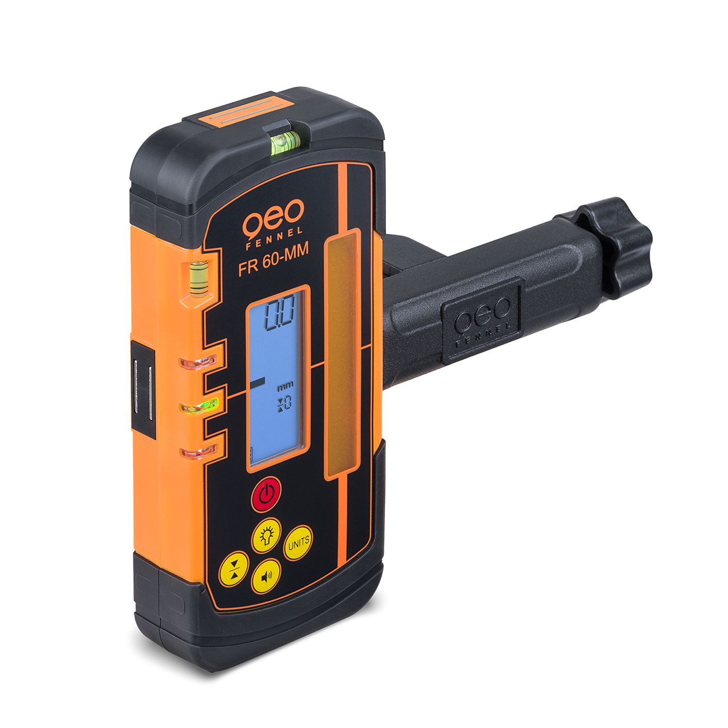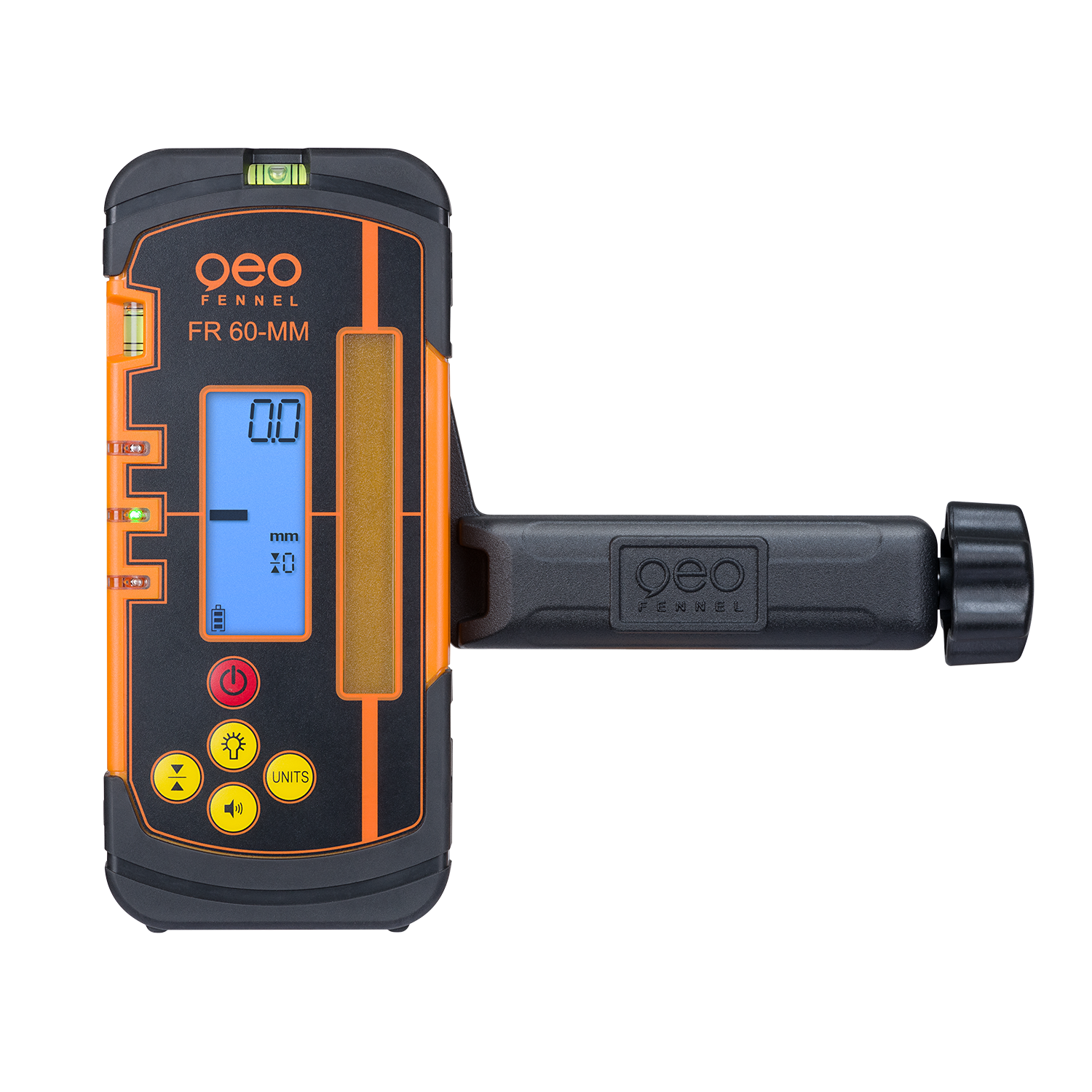 The geo-FENNEL FR 60 laser receiver features a digital laser height display in mm, a reception window with a length of 60 mm and is ideal for rotating lasers with a red or green laser beam. Like the FR 50, the FR 60-MM has a robust housing with dust and water protection to IP 67 and a large, easy-to-read and illuminated display for optimum readability under all conditions. The laser receiver is distinguished by an extremely robust metal retaining clip for the leveling staff, an all-metal design with clamping jaws and is therefore especially designed for use on round and angular rods.